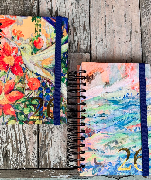 Pasta dura con ilustraciones de mis pinturas y detalle en foil dorado.