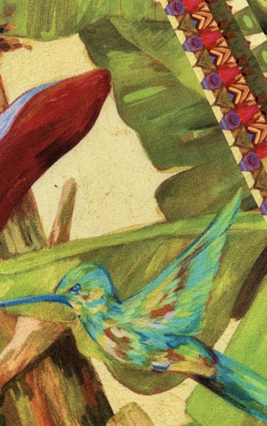 - Adéntrate en el paisaje de mi amada tierra Chiapaneca. «Plátano», es una obra que realice en técnica original de acrílico y hoja de oro sobre tela, ahora en pañoleta.