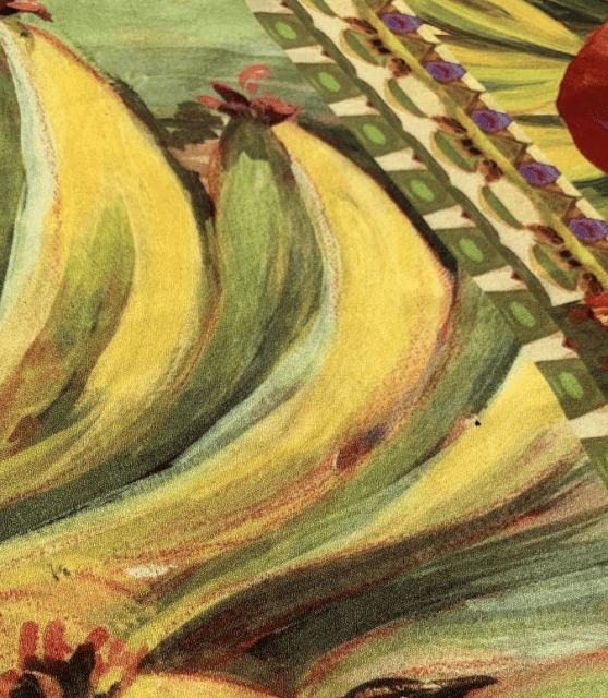 Adéntrate en el paisaje de mi amada tierra Chiapaneca. “Plátano”, es una obra que realice en técnica original de acrílico y hoja de oro sobre tela, ahora en pañoleta.